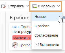 •зажмите тикет левой кнопкой мыши и перетащите его в нужную колонку; •щелкните по идентификатору тикета или используйте горячие клавиши CTRL+КЛИК, нажмите на кнопку В колонку и выберите нужную колонку: