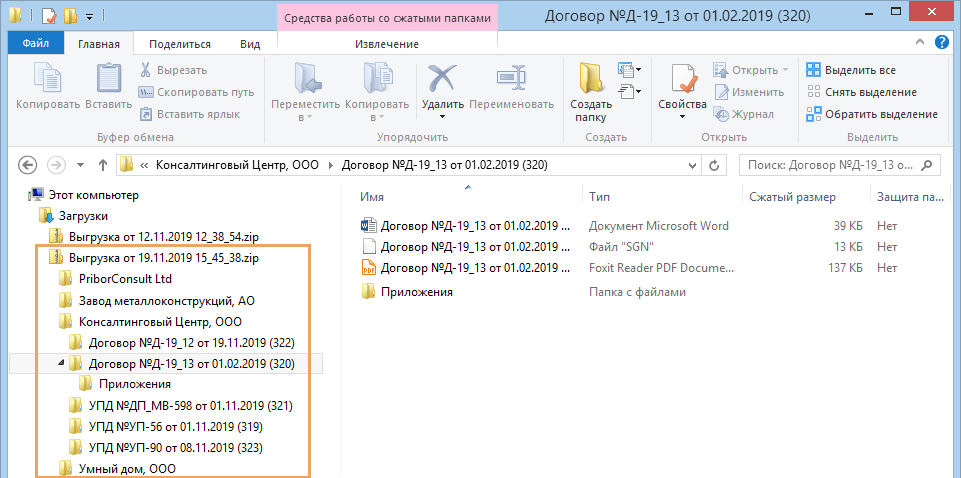 При выгрузке документов указаны параметры: В результате выгружается ZIP-архив с подпапками для каждого контрагента, от которого поступили или которому выставлены выгруженные документы. Выгруженные документы размещаются в подпапках с наименованием соответствующего контрагента. Если у документа есть приложения, то они выгружаются в подпапку «Приложения»: Для документов внешнего ЭДО выгружается несколько файлов, подробнее см. таблицу. |