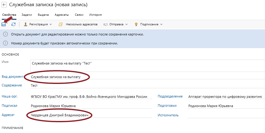 Нажмите на кнопку Сохранить, служебной записке автоматически присвоится регистрационный номер