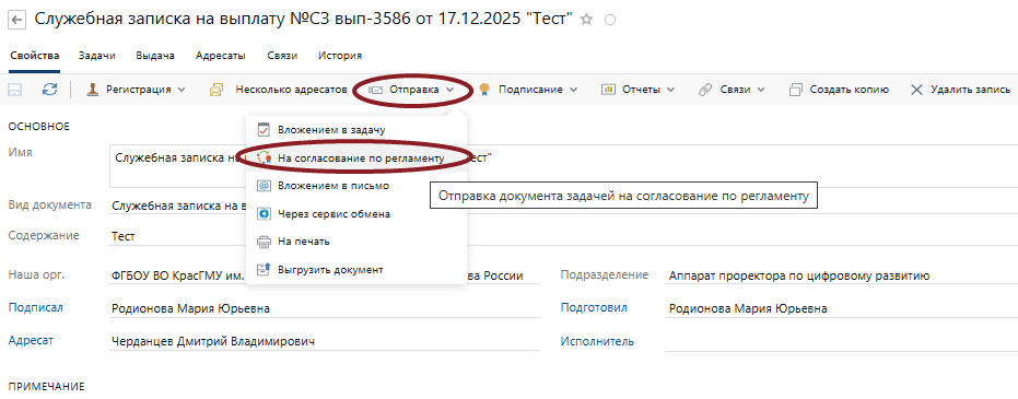 После сохранения файла, отправьте документ на согласование по регламенту для дальнейшего рассмотрения ответственными подразделениями (для этого на панели действий нажмите на кнопку Отправка, выберите На согласование по регламенту).