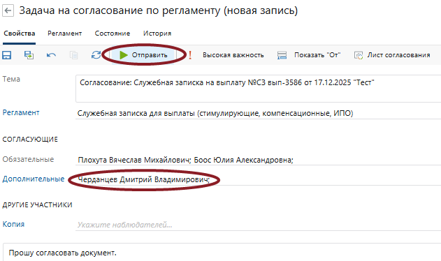 В открывшейся карточке задачи на согласование по регламенту, заполните строку Дополнительный согласующий* (укажите курирующего проректора) и других участников при необходимости. Обратите внимание на то, что задача на согласование будет направлена согласующим друг за другом в том порядке, в котором они внесены, что означает, что согласующие должны указываться по иерархии должностей