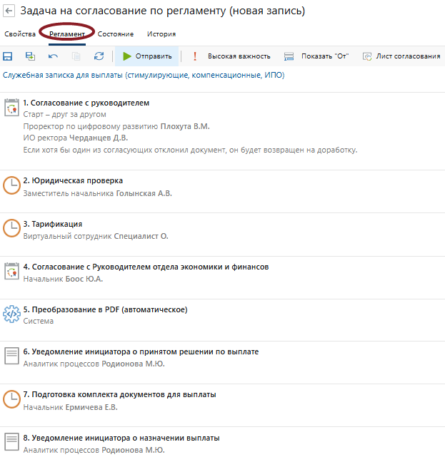 Обратите внимание: на вкладке Регламент вы можете посмотреть все предстоящие этапы пути служебной записки в соответствии с выбранными параметрами и заполненными полями в п.п. 1.2-1.5.