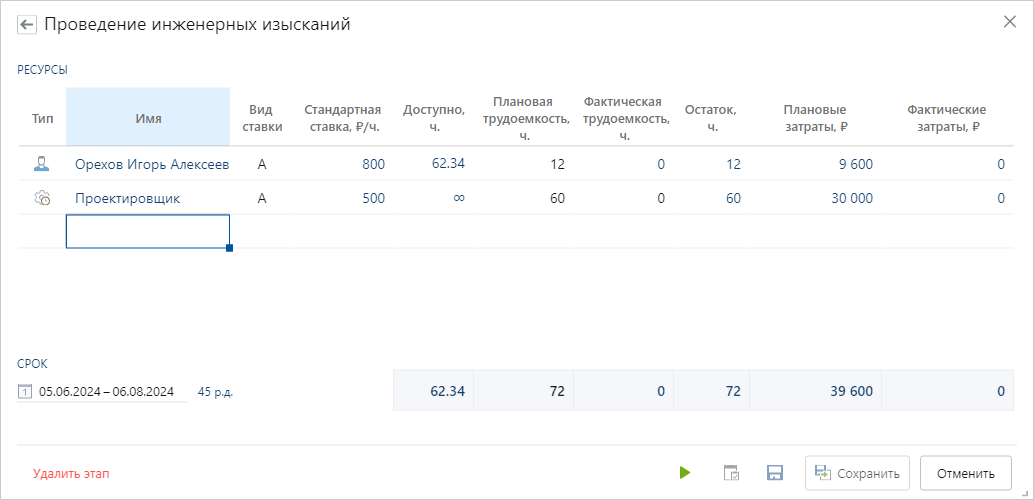 *Имя сотрудника или производственного ресурса. Начните вводить имя, затем в выпадающем списке с найденными ресурсами выберите нужный пункт. Если подходящих записей справочника Ресурсы не найдено, то поиск выполняется по справочнику Сотрудники. При выборе сотрудника для него создается и назначается ресурс. ПРИМЕЧАНИЕ. Если назначить сотрудника не удается, проверьте, есть ли у вас права на создание ресурсов. Подробнее см. в разделе «Ресурсы». Если перед назначением ресурсов в карточке этапа был указан Ответственный, он автоматически добавится в первую строку таблицы. Тип ресурса и количество часов в столбце Доступно заполняются автоматически при выборе ресурса. Вид ставки. По умолчанию используется вид, указанный в карточке проекта. При необходимости вид можно выбрать вручную. Стандартная ставка заполняется автоматически на основе вида ставки. Если для ресурса указано несколько ставок одного вида, то используется актуальная на плановую дату начала работ. Посмотреть информацию о ставках можно в карточке ресурса. Чтобы открыть ее, наведите указатель мыши на имя ресурса и нажмите на кнопку ПРИМЕЧАНИЕ. Если в столбце отображается значение 0, это значит, что у ресурса нет ставки выбранного вида, актуальной на дату начала работ. Плановая трудоемкость. Планируемая загрузка по этапу в часах. На основе плановой трудоемкости и ставки автоматически рассчитываются Плановые затраты. Остальные поля заполняются в ходе исполнения работ по плану для учета фактической трудоемкости и затрат. |