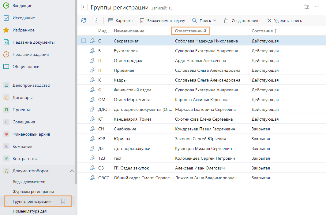 1.В модуле «Настройки документооборота» в списке записей справочника Группы регистрации нажмите на кнопку