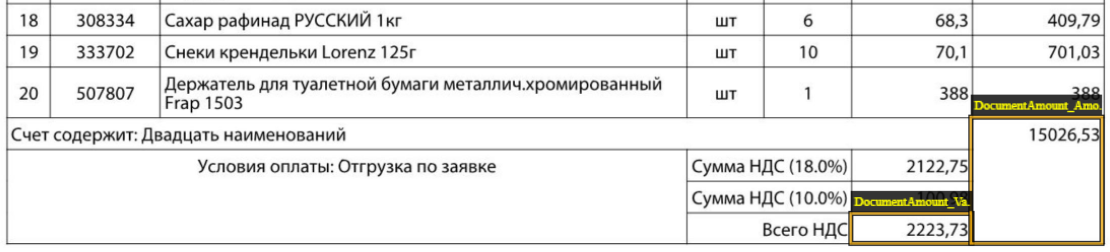 2.Размечайте все итоговые суммы, даже если они выражены иными словами. Например, «Итого» и «в том числе НДС» размечайте как «Сумма с НДС, по документу» (табличный) и «Сумма НДС, по документу» (табличный), соответственно: