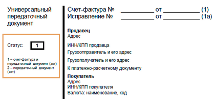 *Вид документа. Назначение универсального передаточного документа. Если документ выполняет функцию: •первичного учетного документа, то выберите «Документ об отгрузке товаров (выполнении работ)»; •счета-фактуры и первичного учетного документа, то выберите «Счет-фактура и документ об отгрузке товаров (выполнении работ)». Совет. Назначение бумажного экземпляра универсального передаточного документа можно определить по значению, которое указано в реквизите «Статус». Если указано значение «1», значит документ выполняет функцию счета-фактуры и первичного документа, если значение «2» – функцию первичного документа: