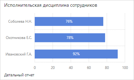 ПРИМЕЧАНИЕ. В компании с территориально-распределенной структурой для сотрудников может быть настроена работа в разных часовых поясах. В этом случае, если сотрудник просматривает свою исполнительскую дисциплину в виджетах, данные отображаются в его часовом поясе. А если руководитель анализирует исполнительскую дисциплину сотрудников, данные отображаются в часовом поясе руководителя. Если у сотрудников показатели отклоняются от нормы, проверьте, в каком часовом поясе они работают.